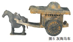 元代灰陶马车(图5),通高16.9厘米,长41.4厘米,宽8厘米,为海南省博物馆馆藏一级文物。材质为泥质灰陶,马匹昂首挺立,口含衔辔,双耳竖立,肌理流畅,颈部长鬃下垂于两侧,背上覆盖有鞍袱,马尾下垂,立于托板之上。车厢仿木结构,窗棂清晰,车辕饰有龙首,车轮辐条分明,顶部略呈穹窿状,前端出檐较长,车厢三面有壁。