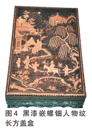 明代黑漆嵌螺钿人物纹长方盖盒(图4)是反映明代工艺与人们生活场景的珍贵文物,制作精美,现藏于中国(海南)南海博物馆。盒盖画面构图丰富,采用精湛的螺钿工艺,描绘了明代士人生活的优雅场景:人物或对弈或携琴,画面焦点是一位策马疾行的高士,在五彩螺钿的辉映下,骏马形象突出,造型矫健。这里的马,已非神话天马或征战铁骑,而是融入士人日常出行与交游的生活化意象,与亭台、林木共同构成生动的明代风情画,反映了当时的审美情趣与生活意趣。