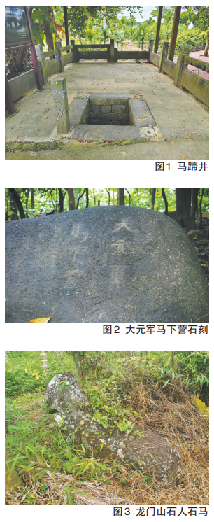 大元军马下营石刻(图2)包含文字石刻与脚印石刻两部分,位于乐东黎族自治县尖峰镇尖峰岭山脚下,是一处珍贵的元代摩崖石刻。文字面积约59.81平方米,镌刻于一块半圆锥形巨石之上,阴刻四行隶书:“大元军”“马下营”“甲午至元三十一年正月十日”“十一日到黎婺山”。其南侧约10米处,另有一方石板之上凿刻有两个清晰足印与四个马蹄印迹,面积约51.41平方米,两者构成一组完整的遗存。